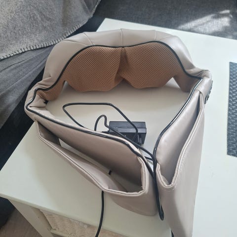 Mykt, behagelig materiale. Som nytt. Vekt inkl eske 1.943 kg, L 39 cm, H 23 cm, B 15 cm. Vanskelig å angi mål på apparat, da det er litt "uformelig".