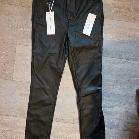 Bubbleroom sorte skinnbukser i imitert skinn, størrelse 38 for kvinner. Jeg opplever buksen som liten i str. Er normalt en str. 36 og synes denne passer fint. Passer nok best fra 36 til mellom 36/38. Laget av materiale som gir en skinnlignende finish. Buksen har glidelåsdetaljer ved ankler og normal midje, glidelås i siden. Passer til daglig bruk og ulike anledninger, perfekt til julebord, fest eller jobb-arrangement! 💃🎄🌟