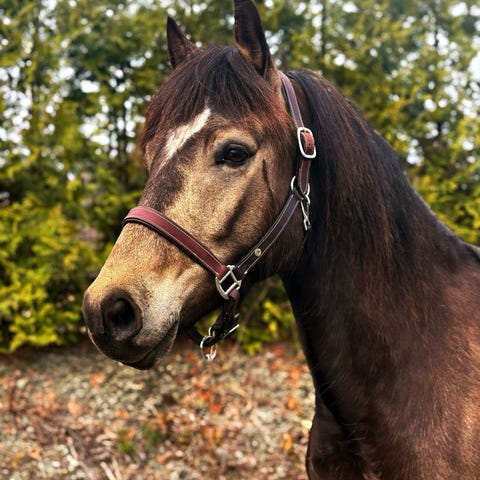 Mor er 18 og er rolig og god, men har mykje å gi om du ber om det. Hun kan gå frå å jobbe med galoppfatninger til å være barnehest i løpet av samme økt. Eg rir henne selv både med bitt, bittløst og med halsring og har alltid gode bremser og styring.