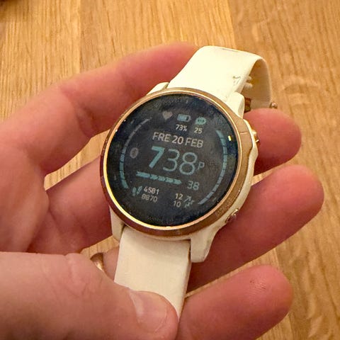 Suunto 9 G1 smartklokke med hvit silikonrem. Klokken har en rund urskive med digital skjerm som viser tid og annen informasjon. Designet for bruk på håndleddet med justerbar rem for komfort. Egnet for aktivitets- og treningsmåling.