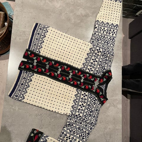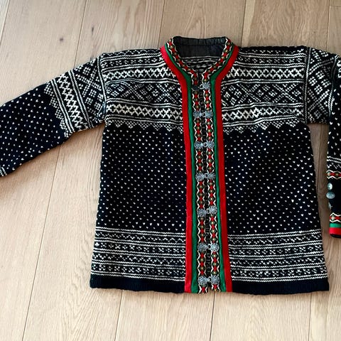 Meget pent håndarbeide. Original setesdalskofte. Håndstrikket i ren ull og håndbrodert halsringning og mansjetter. Kofta er ikke mye brukt, ingen slitasje eller skader. Målene: hel lengde 63cm, fra u. arm 43cm, bredde fra u. arm 52cm, erml. 54cm. Skulderbredde er i likhet med u. armsbredde 52cm, men er likevel ganske tøyelig . Siden ingen barn ønsker å arve dette fine plagget tenker jeg å selge. Mine mål: høyde 173cm, Garn, strikketimer , broderi og montering koster. Jeg tenker kr. 2800 -.
