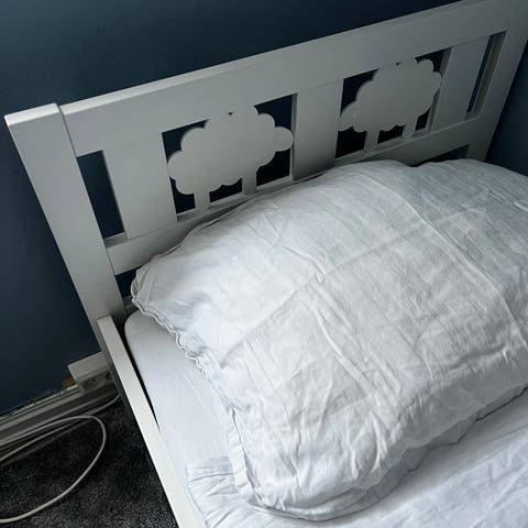 Madrassen og bunnen ble også kjøpt nye sammen med senga. Brukt beskyttelse på madrassen.