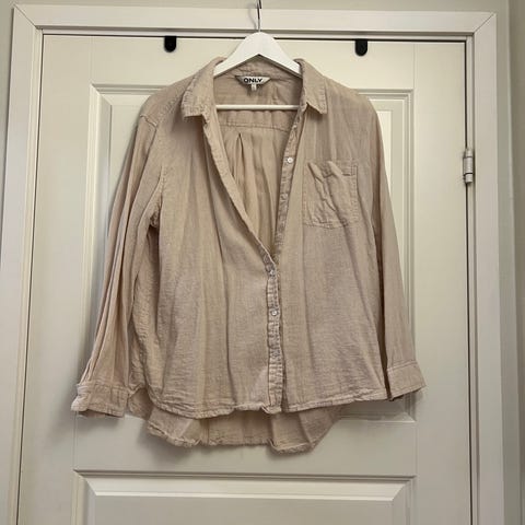 Vintage skjorte i lett, tynt stoff (materiale ukjent) linlignende, med stripemønster i beige og hvitt. Romslig passform med avrundet krage. Noe slitasje i stoffet (se bilder), men fortsatt stilig til casual eller vintage‑look.