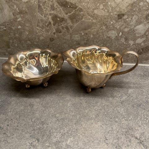 Fløte og sukkerbit sett i sølvplett