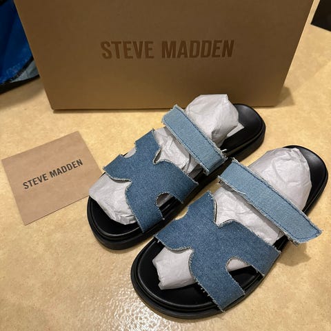 Pent brukte denim platåsandaler fra Steve Madden. Usikker på hvilken modell det er, men ligner på den populære Bigmona eller Mona modellen. Sandalene har en chunky og myk såle, med stretch bånd som ligner denimstoff. Passer str. 38