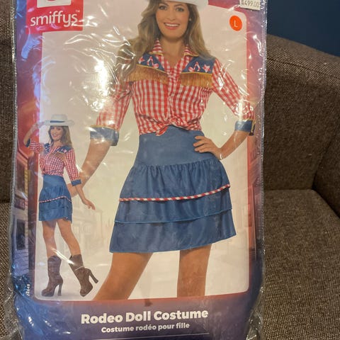 Skjørtet har stramming foran slik at man kan ha det kortere eller lengre kun foran, følger med «hansker» til hender, smykke og sko. Korsettet må syes litt på toppen men skal nok være enkelt, tar imot bud men ikke skambud.