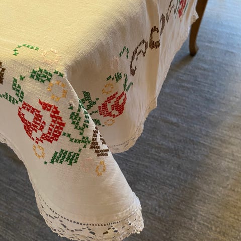 Jeg ønsker å selge en pen eldre hvit liten duk, 56 x 56 cm, et par bittesmå flekker, mønster - blomsterbukett brodert med hvitt og svarte kanter, selges kr. 100,-.