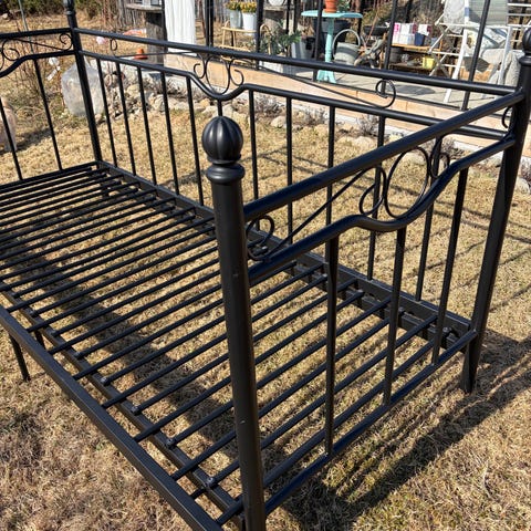 Grei seng, med to gavler og bunner, og to nattbord, selges uten madrasser. Plass til to 75x200 madrasser eller en på 150x200