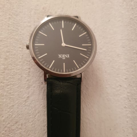 Selger en Inex klokke med hvit urskive og sort lærrem. Minimalistisk design med tydelige tall og lettlest urskive.