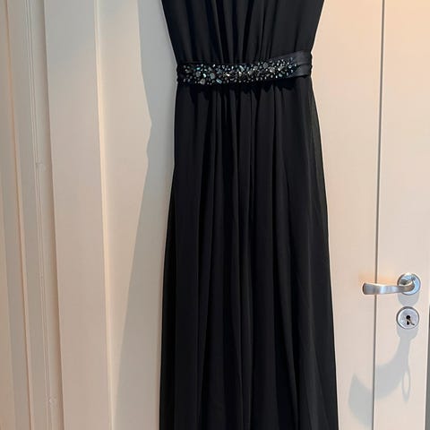 Selger en lite brukt maxikjole fra Jeane Blush i str small. Hel og pen. Sort med perledetaljer og dyp utringning.