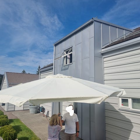 Brukt Haugesund parasoll selges. Hengeparasollen er 300 cm Ø, og i fargen antrasitt/ mørk grå.