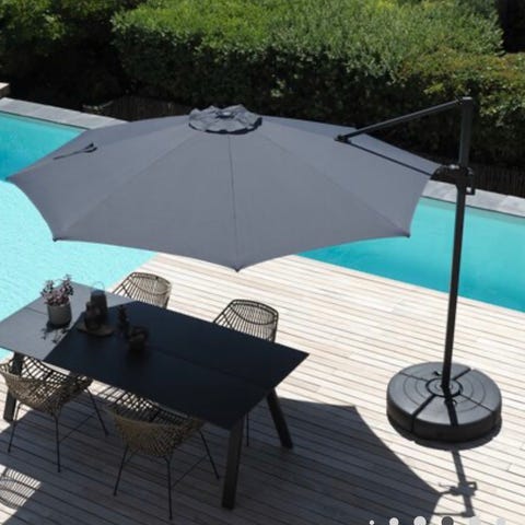 HAUGESUND hengeparasoll leveres med en solid parasollfot som rommer 100 liter, noe som holder parasollen stabilt og sikkert på plass. Parasollfoten bør fylles med sand og vann for optimal stabilitet. Hjul på parasollfoten gjør det enklere å flytte parasollen rundt.
