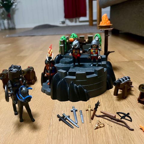 Playmobil ridderborg med to tårn, port og festningsvegger i svart og rødt. Inkluderer flere tilbehørsdeler som katapult, ballista, våpen, skjold, hjelmer, hester og figurer. I tillegg følger et rødt og svart skip med master og kanon. Passer for barn.
