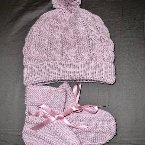 Selger et helt nytt, ubrukt sett med baby-lue og skjerf.