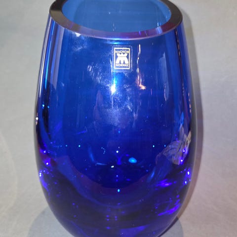 Matt, formblåst og sandblåst glass. Høyde 18,3 cm, vekt 1,27 kg.