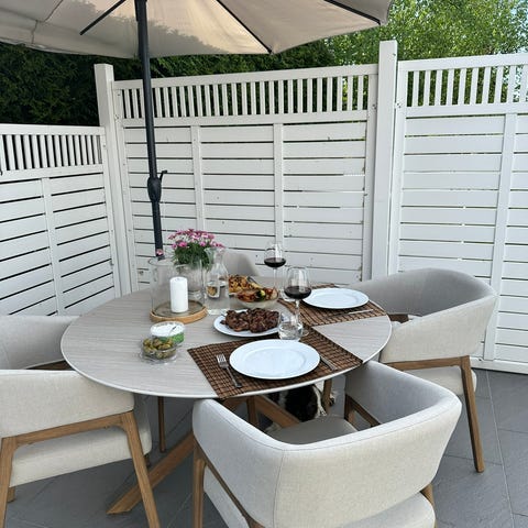 Utemøbel bord med rund form og diameter på 120 cm. Bordet har en stabil metallbase. Passer for utendørs bruk som spise- eller kaffebord. Kjøpt i sommer
