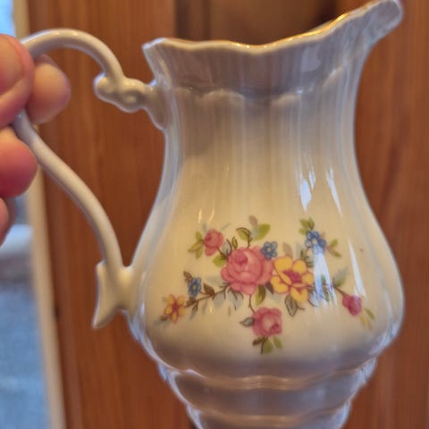 Blomsterdekorert, kan se ut som gullkantene er mangler noe farge. Ukjente merke.