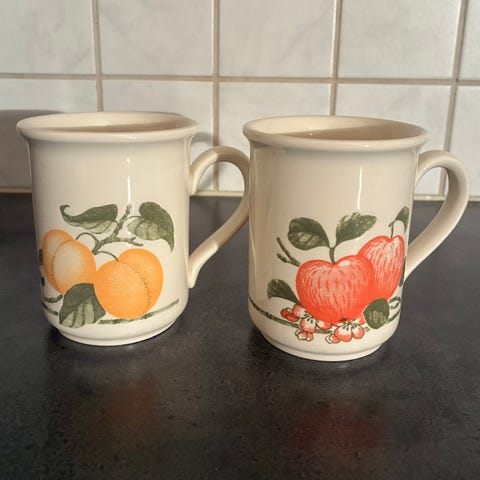 De er fine i glasuren inni og utenpå, men ene hanken er stygg, men ikke løs. Så det ikke før jeg snudde koppene på hodet og kikket, så ikke lett og se.