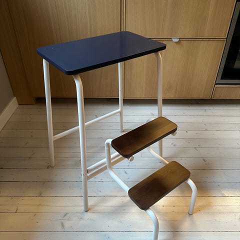 Retro krakk med trappetrinn som kan vippes ut, også kalt husmorkrakk/husmorstol. Stolen har patina i form av litt flekker på setet og rust på stolbena, men ellers i god stand. Trappetrinn i tre.