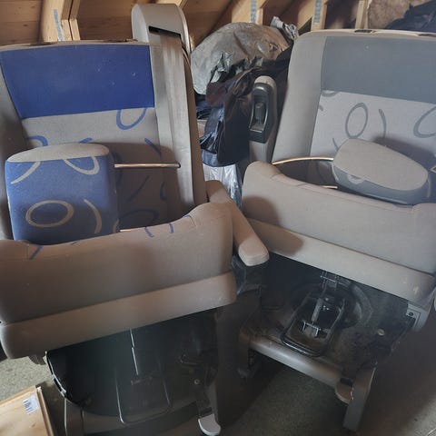 Selger en fireseter benk fra Mercedes-Benz, grått stoffmateriale. Setet har integrerte festepunkter og oppbevaringsrom under setet. Som nytt. Mangler ett lite plastdeksel over det ene feste til belte.