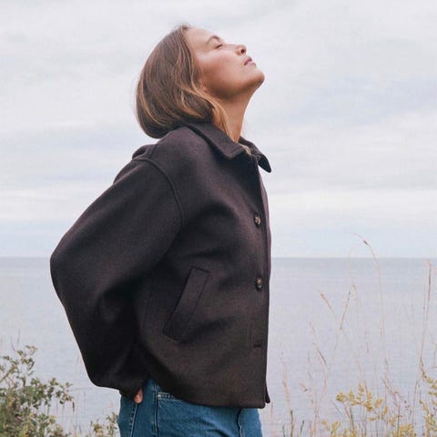 Svart jakke i boucle-materiale med cropped lengde. Jakken har V-utringning, knappelukking foran og praktiske paspolerte lommer. Den korte lengden passer godt til høytlivsbukser.