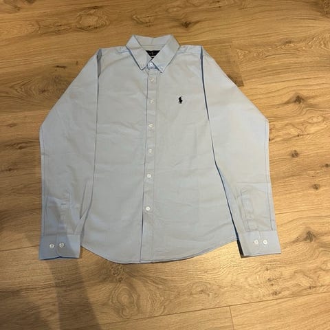Ralph Lauren skjorte i lys blå farge, størrelse M for herre. Skjorten har lang arm og knappelukking foran.