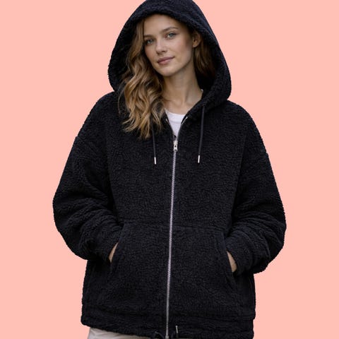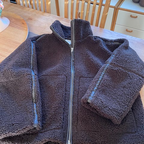 Teddyjakke fra H&M, størrelse XL. Jakken har en myk og teksturert overflate, med glidelås foran og to lommer. Romslig i størrelsen. Så og si ubrukt da den er litt stor til meg.