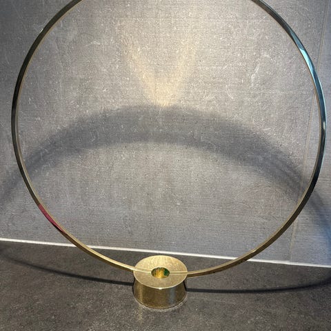 Rund lysestake til telys, for å henge på vegg. Gullforgylt metall. Fra Menu. Diameter 44 cm. Har noen flekker, men synes ikke. Veldig fin. Selges fordi den ikke brukes.