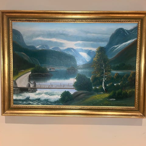 Landskapsmaleri som viser fjell, elv og et hus i en naturlig setting. Maleriet er innrammet med en dekorativ ramme. Kan brukes som veggdekorasjon i hjem eller kontor.