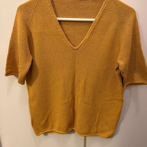 Den er kløfri, strikket av selger i røyk og dyrefritt hjem.