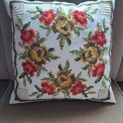 Retro håndbrodert pute med roser