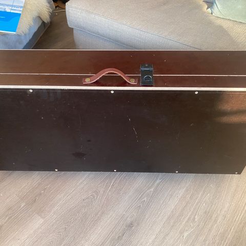 Selger en kiste i tre, med skinntrekk. Mål på kista er BxHxD - 50x50x50cm. Må hentes