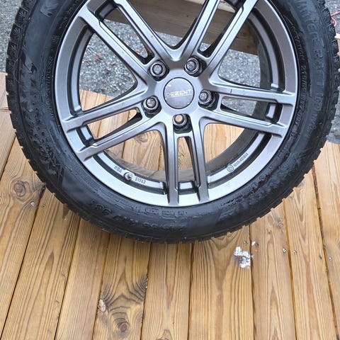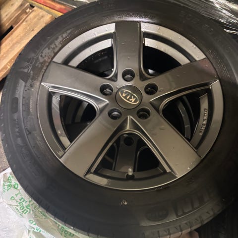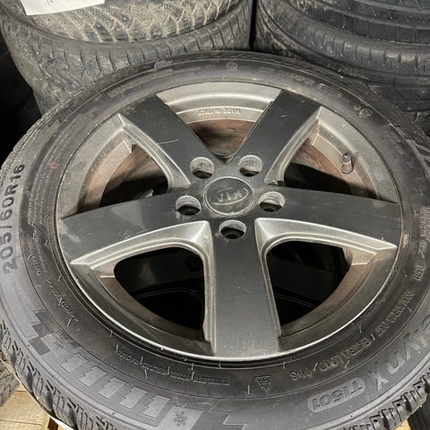 Jeg selger et komplett sett med vinterhjul til Kia Soul, Kia Niro, Nissan Leaf, Hyundai Ionic. Felgene er ripete, men ikke bøyd. De leveres med trykksensorer, og dekkene er 2 stk. Hankook8mm, og 2 stk. TOYO, ca. 6 mm.