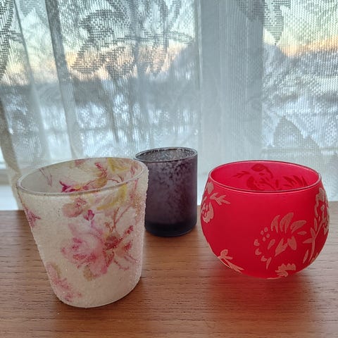 Søkeord: y2k, black design stil, retro interiør, frostet glass, farget glass, telysholdere, vase, 2000-tall
