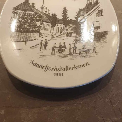 Dekorative historiske tallerkener fra årene 1978 til 1992, mangler 1991. Tallerkenene viser ulike motiver fra Sandefjord. Hver tallerken har en firkantet form med illustrasjoner i svart-hvitt, samt årstall og tekst under motivene. På baksiden er noen ferdig med oppheng, mens andre er tilrettelagt for trådoppheng. Alle tallerkenene er hele og godt bevart. Tallerkenene er samleobjekter og passer til dekorasjon. Selges for kr. 75,- pr. stk.