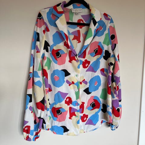 Unik og kul bluse kjøpt i London 🤩 Den er helt ny og kun prøvd på, men tags mangler. Ekstraknapper følger med. Selges fordi den aldri ble brukt! Merket er Caroline Gardner, den består av 100 % viskose; tynt og deilig stoff. Blusen er kullgrå i basen og har store blomster i flere farger, litt sånn Marimekko-aktig 😊 Den finnes på nettsiden carolinegardner.com, og prisen er 78 £ (tilsvarende 1058 kr høst 25). Størrelsen er one size, men passer en XL. Det kan være en stilig statement-bluse, som jeg synes det er, eller en lounge-bluse, eller pysjamas-skjorte, som jeg sjokkerende nok oppdaget at det sto på kvitteringen 😂🤣 På nettsiden heter den Charcoal Bloom Pyjama Shirt, og de to siste bildene er derfra. Håper noen kan få glede av denne 🥰