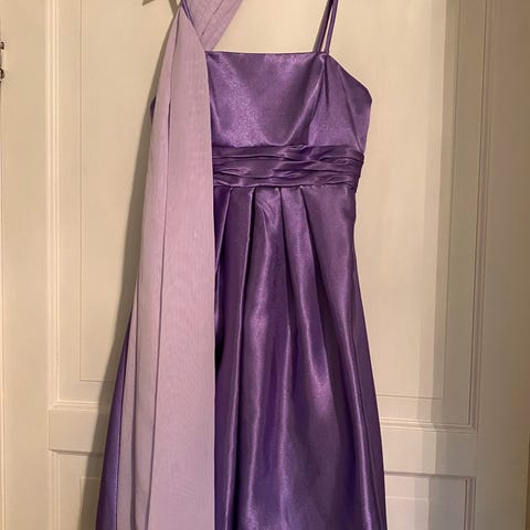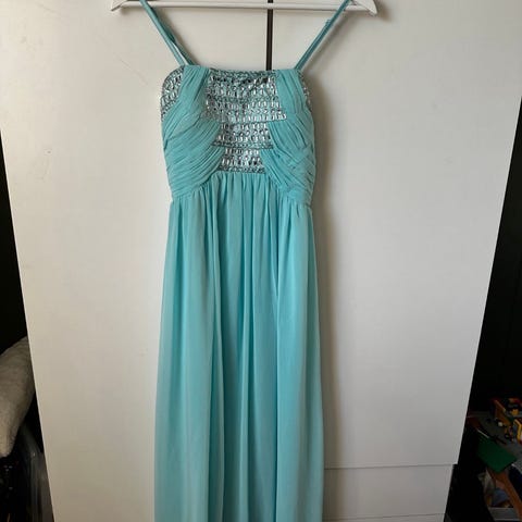 Lang, hvit selskapskjole med «sølvpaljetter».