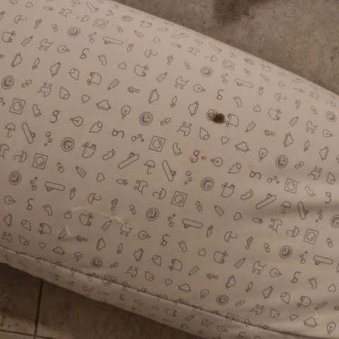 Ingen skader eller feil. Men er blitt noen flekker på «innerputen» siden den ikke kan vaskes.