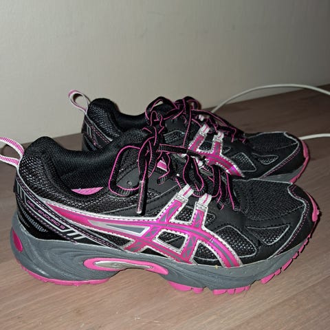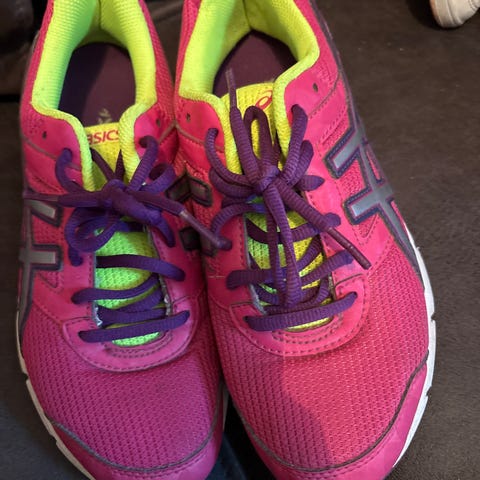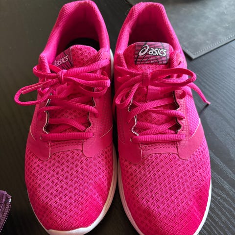 Asics joggesko i størrelse 37. Skoene har en rosa og svart fargekombinasjon med hvit såle. Materialet ser ut til å være pustende tekstil med syntetiske detaljer. Egnet for daglig bruk og lett trening.