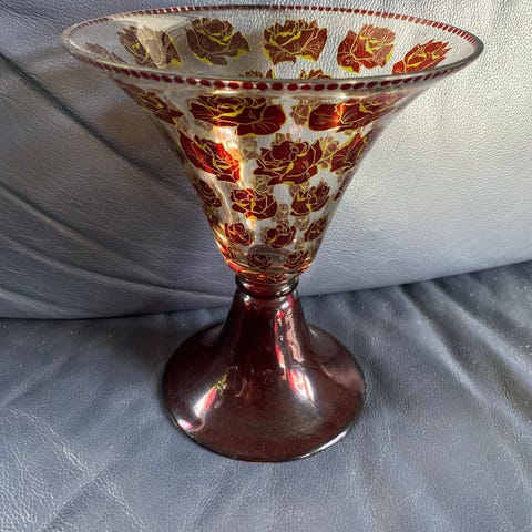 Vakker, rød gullbelagt vintage Egermann Bohemia-glassvase fra Tsjekkia. Med blomstermønster. Håndslipt og håndmalt. Har fortsatt merke på. Denne er arvet, tror den er laget mellom 1960-1980.