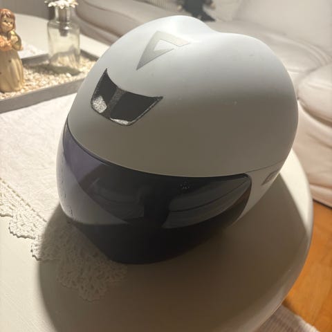 Kjøpt ny Juli 2025, farge hvit gloss, tilstand som ny , brukt 2 temporitt og 5-6 treningsturer, størrelse S/M, følger med 2visir (mørk og klart glass), hjelm bag, fitpads, vekt 450g.