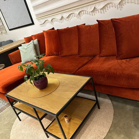 Deep sofa i velur selges. Har en liten flekk, men ellers i hel og pen. Kostet opprinnelig 16.000. Dersom du er interessert har jeg også 4 velur i samme blåfarge i gardiner samt 2 pynteputer som passer perfekt til sofaen (vist på bildet) dette kan du får for 1000,- i tillegg til sofaen.