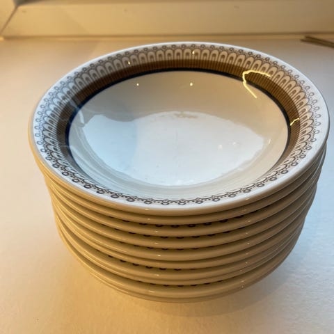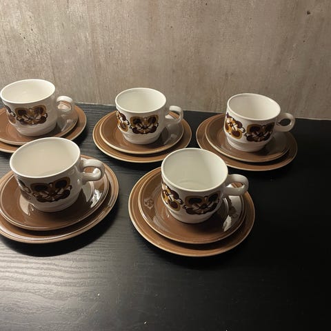 Nydelig, vintage servise fra Biltons Staffordshire selges rimelig. Fire flate og fire dype tallerkener. De flte er 22,6 cm i diameter. De dype er 20 cm i diameter. Velholdte og fine, men bruksmerker kan forekomme.
