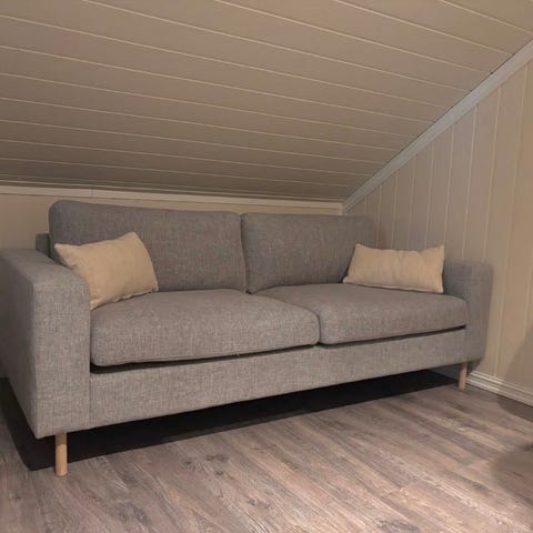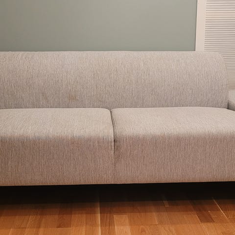 Fargen på sofaen heter Nantes Sea Green. Det ser ikke ut som om Bolia selger denne fargen lenger. Den er blågrønn på fargen, men heller mer mot blå enn grønn. Stoffet i sofaen har meget høy slitestyrke med hele 120 000 Martindale. Sofaen er godt brukt og trenger litt kjærlighet. Alle modulene har varierende grad av solbleking, noe som gjør at fargen ser litt forskjellig ut fra modul til modul. Den ene hjørnemodulen har en ganske tydelig stripe hvor den har blitt solbleket. Den har nok også godt av en rens.