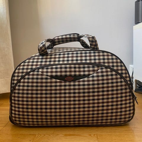Ny og ubrukt trillekoffert med 2 lommer i utsiden og.uttrekkbar håndtak og 2 hjul under.