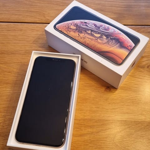 Min kone selger sin pent brukte Apple iPhone XS Space Gray mobiltelefon med 64 GB lagringskapasitet. Enheten har svart farge og skjermstørrelse tilpasset iPhone X-modellen. Telefonen skal kunne kjøres på iOS 18 og har batterikapasitet på 80 % med aktivert optimalisert batterilading.
