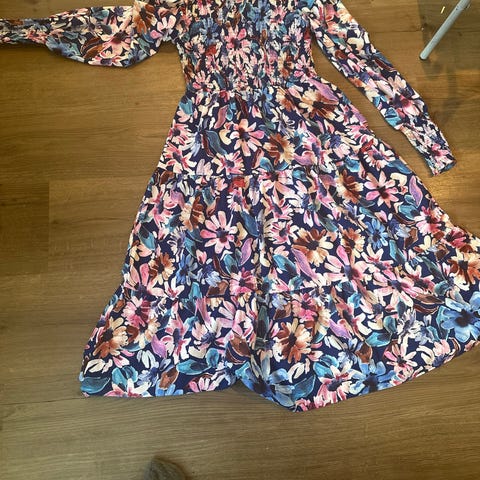 Lindex hverdagskjole for kvinner i størrelse S med blomstermønster. Kjolen har lange ermer og er laget for hverdagsbruk.