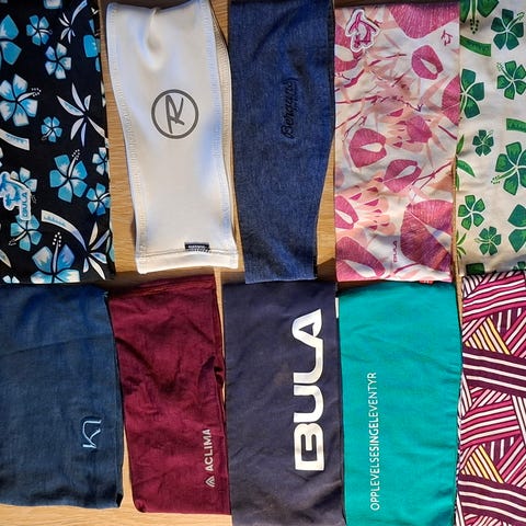 10 pannebånd, pent brukt, 4 er aldri brukt. 2 i ull, Bergans og Devold.