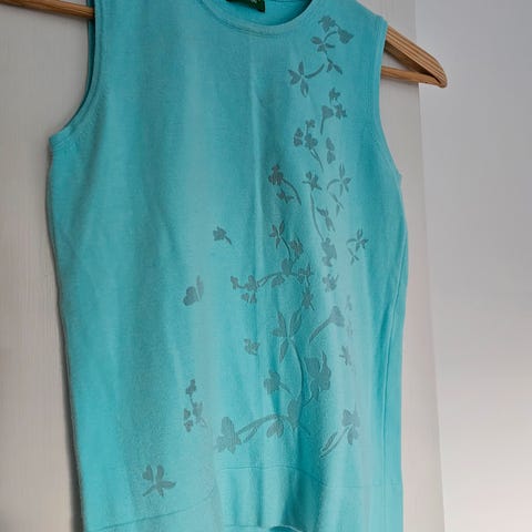 Nydelige topp laget av det italienske merket United Colors of Benetton. Toppen har en klassisk Peter Pan krage med en unik utsmykning av rhinestones. Aldri brukt. Bare hengt i skapet.