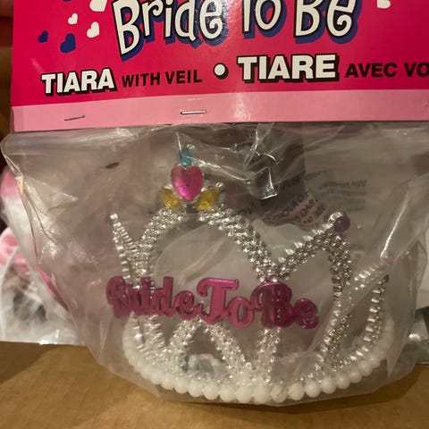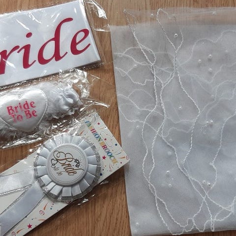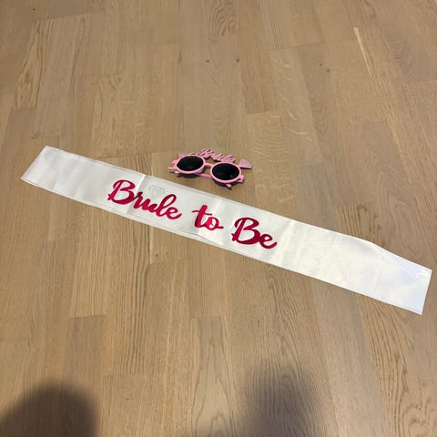 Bride To Be dame tilbehør for bryllup inkluderer en tiara med slør, et hvitt strømpebånd med rosa detalj og et rosa shotglass halskjede med perler. Produktene er designet for bruk i bryllupsfeiringer og bachelorette-fester.